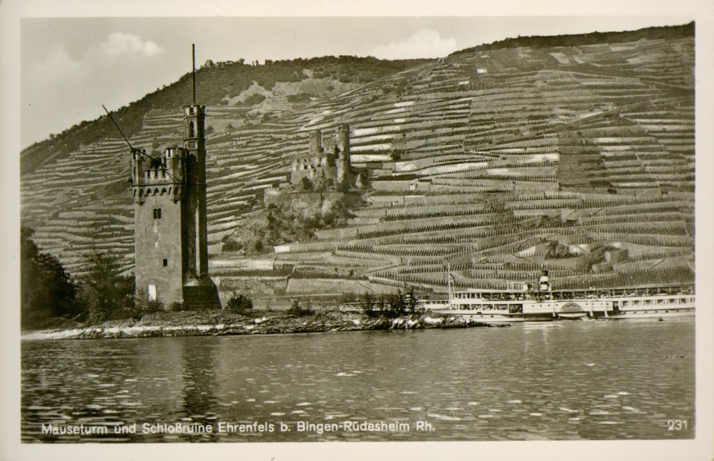 Copyright: image believed to be in the public domain and used for creative, non-commercial purposes. Vintage postcard of Mäuseturm and Ehrenfels Castle near Bingen am Rhein. Published by F. Wagner, postmarked 1960.
